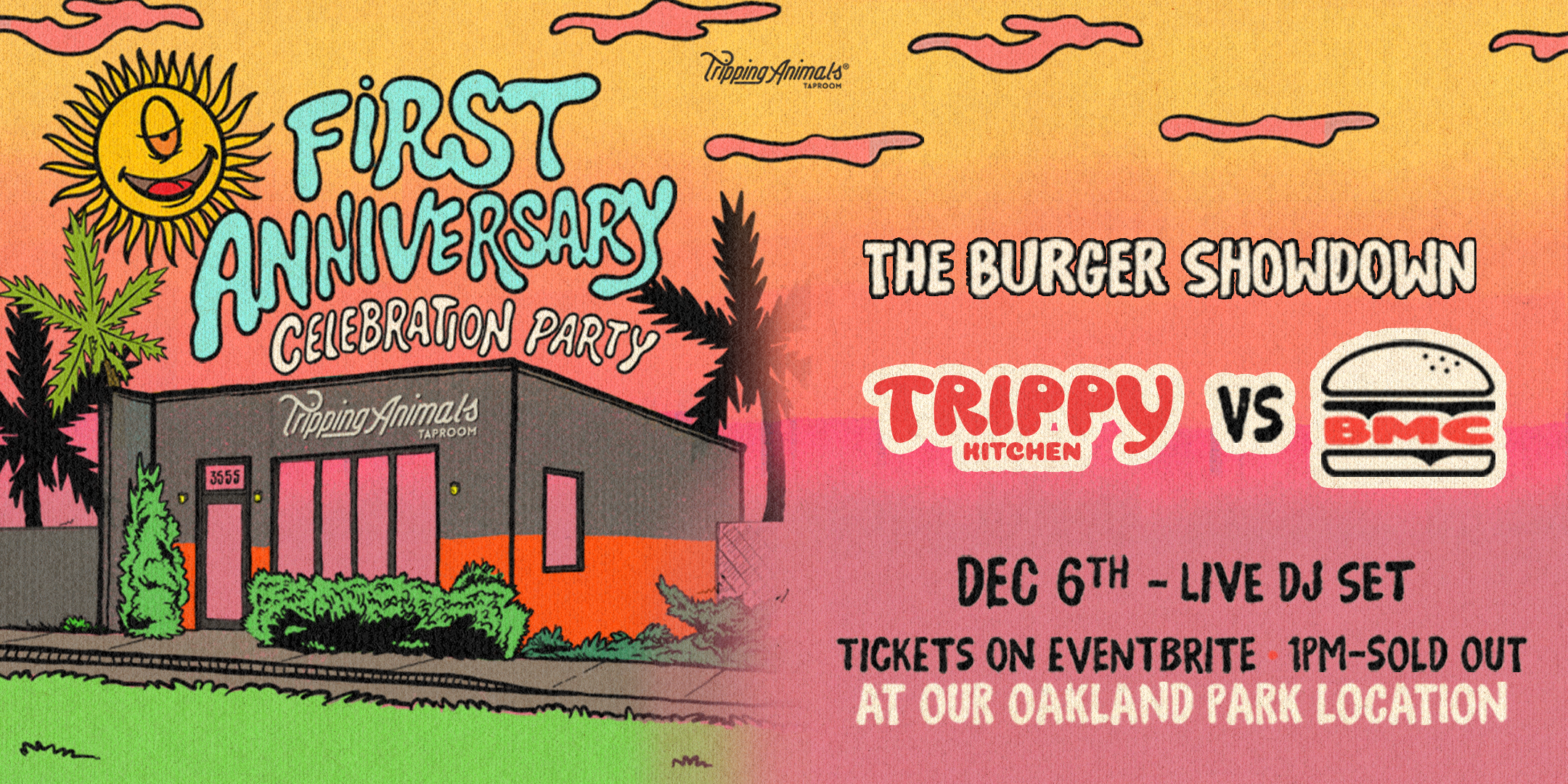 Celebrate 1 year of Tripping Animals Oakland Park with the ultimate burger showdown: Trippy Kitchen vs. BMC.